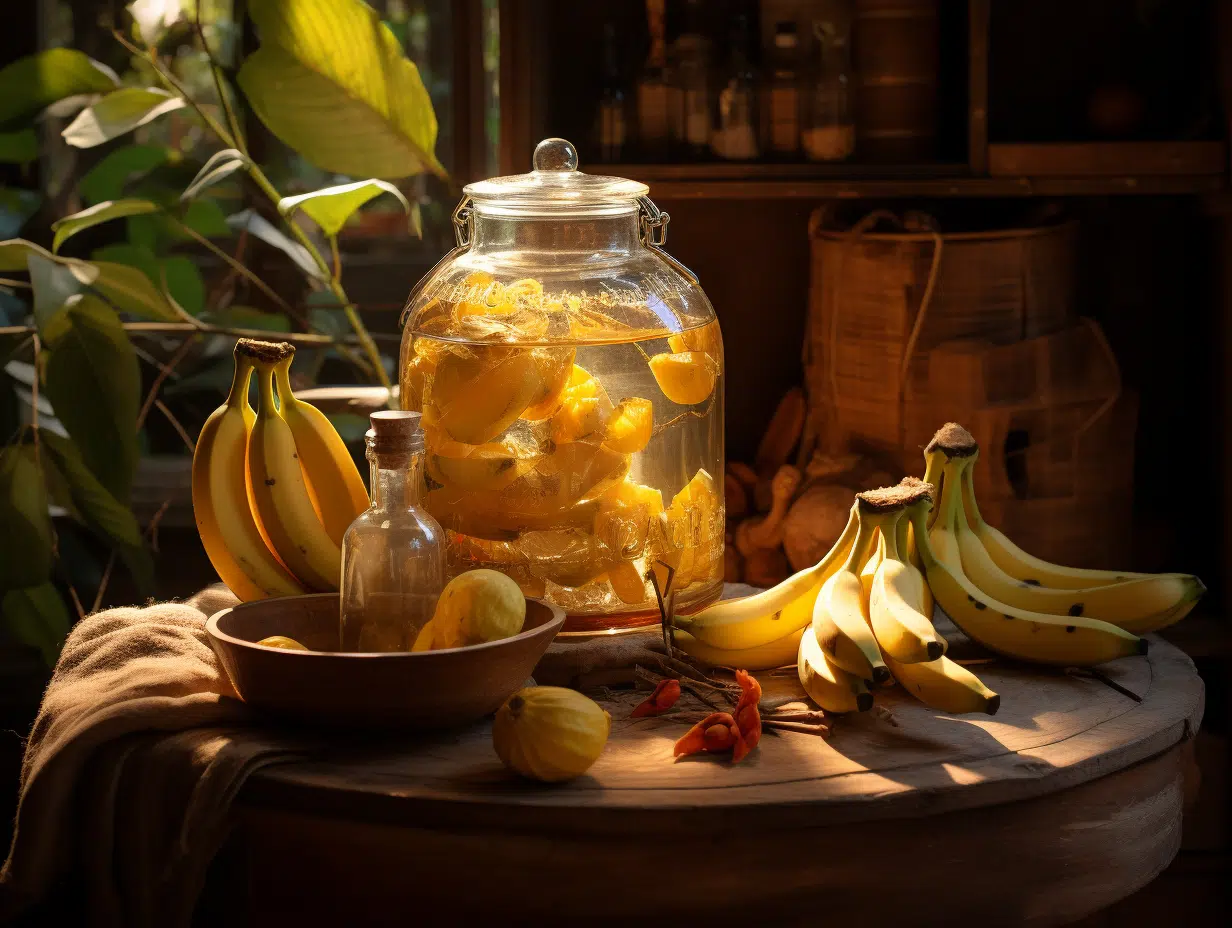 Le récipient choisi pour la macération joue un rôle non négligeable. Optez pour une bouteille ou un bocal en verre avec une fermeture hermétique, garantissant une conservation sans altération des arômes. La bouteille doit être conservée à l’abri de la lumière et de la chaleur pour préserver la subtilité du breuvage. Soyez assurés, observateurs et patients, et votre rhum arrangé banane se révélera être un nectar aux saveurs tropicales, prêt à vous transporter vers les îles de l’Océan Indien, berceau de cette tradition.